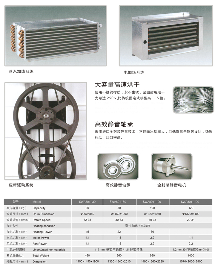 1. 本機(jī)大口徑裝載門,投取衣物方便實(shí)用,并配有透明鋼化玻璃,隨時(shí)可查看衣物烘干情況; 高效靜音軸承 |