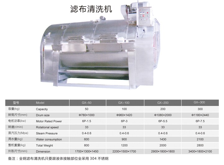濾布清洗機外形美觀大方,高效節(jié)能,運行平穩(wěn),滾籠采用不銹鋼制作,抗腐蝕能力強,經(jīng)久耐用,轉(zhuǎn)軸兩端采用耐酸、耐堿、耐磨性優(yōu)良的氟橡膠油封、使軸兩端不易漏,不會磨損、污染濾布。采用微電腦控制,洗滌時間,洗滌溫度根據(jù)衣物的具體情況任意設(shè)定,使用維修方便,占地面積少,噪音低。